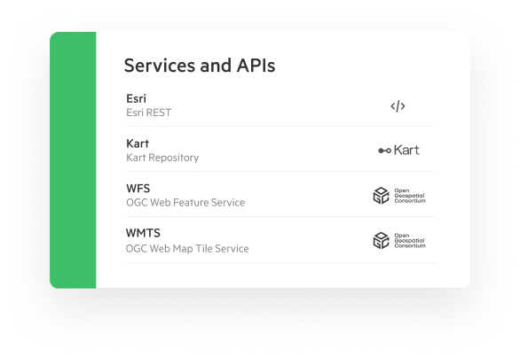 - All data includes agnostic API’s, OGC and Esri REST endpoints and web services out of the box.