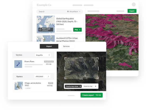 - Generate and host map products connected to their source datasets, like Cloud Optimised Point Cloud previews for LiDAR and vector tiles for vector data.